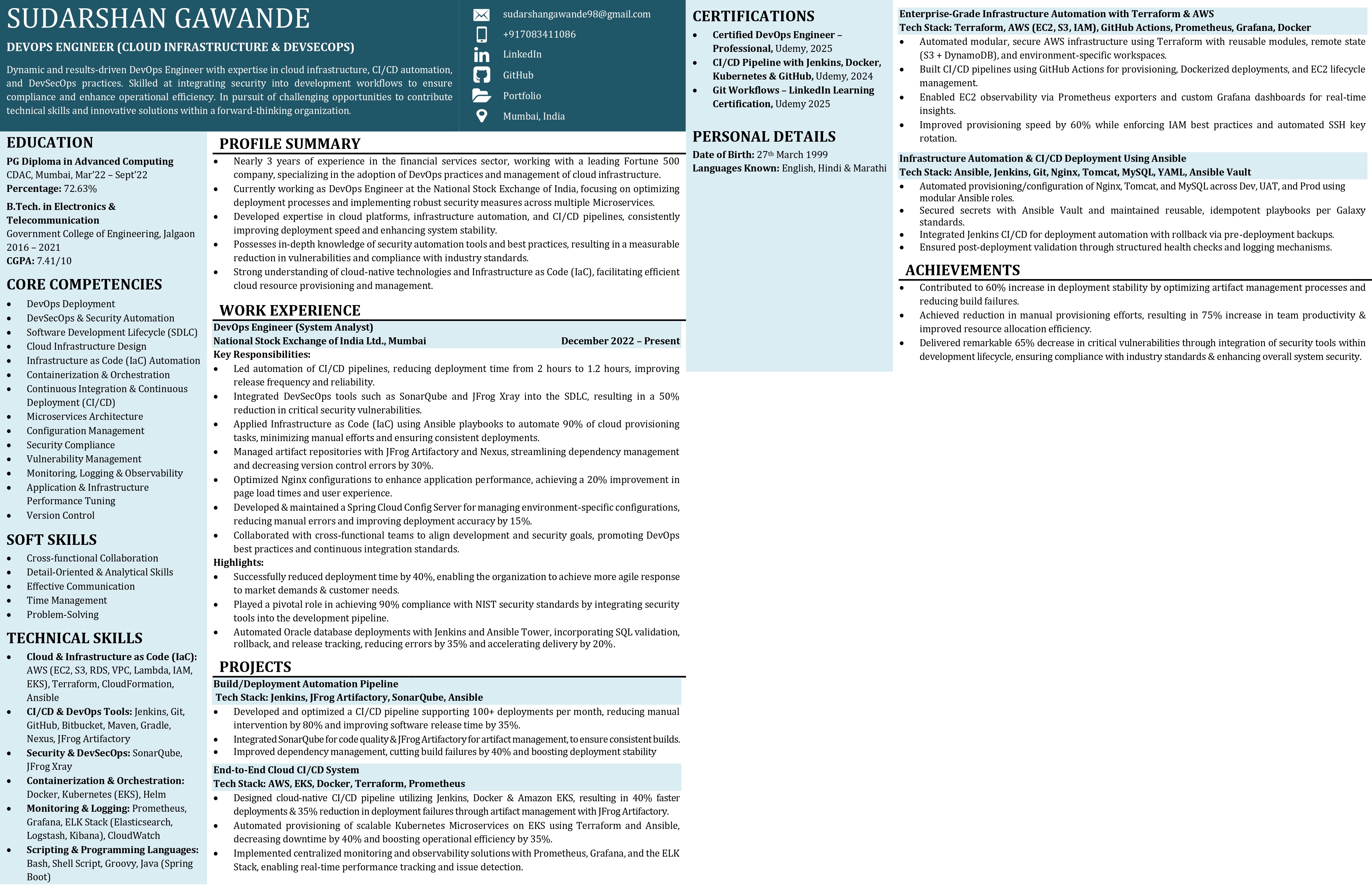 DevOps Engineer with 3+ years of experience in CI/CD automation, cloud infrastructure, and security, specializing in Kubernetes, Docker, Terraform, Ansible, and AWS at National Stock Exchange of India Ltd.